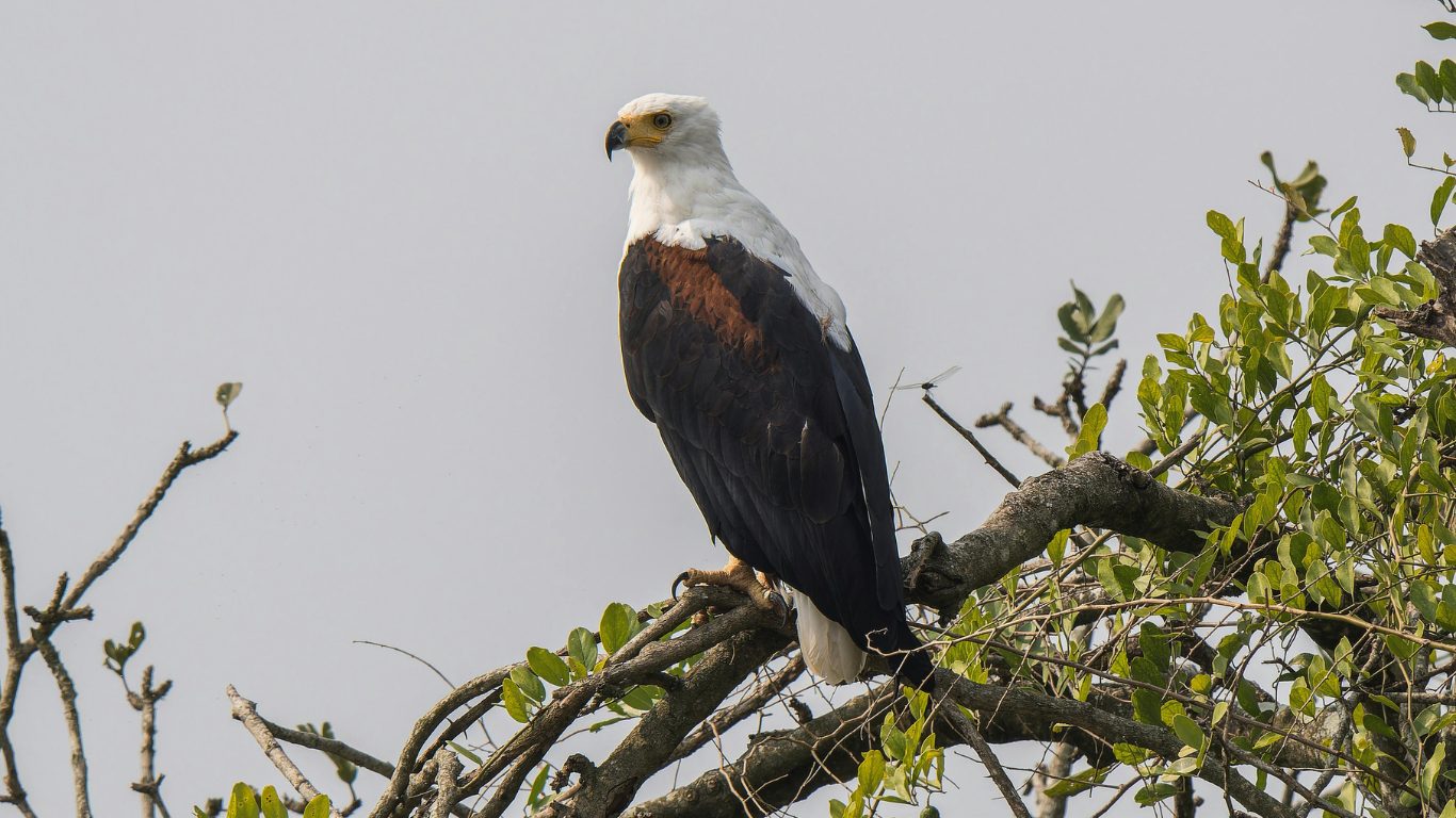 With its white head, piercing cry and feet-first fish strikes, the African fish eagle is the defining raptor of Tanzania's waterways. Pairs hold permanent territories along lake shores and rivers, launching from tall perch trees to snatch fish in a single explosive pass. Lake Manyara is the premier northern circuit location.