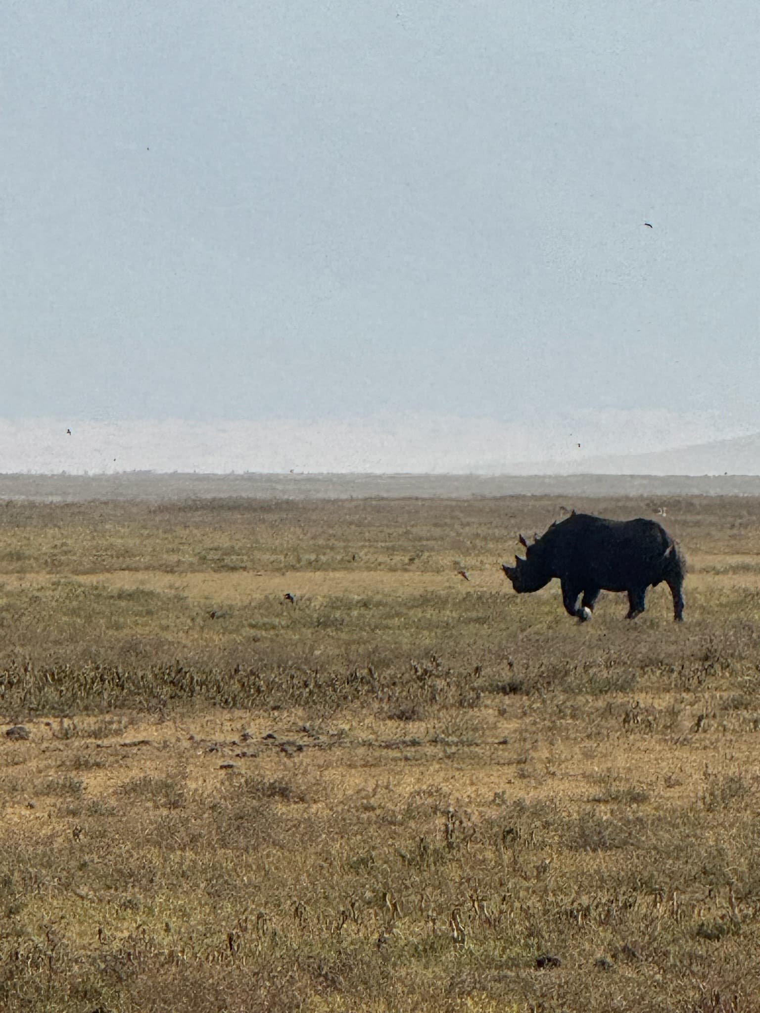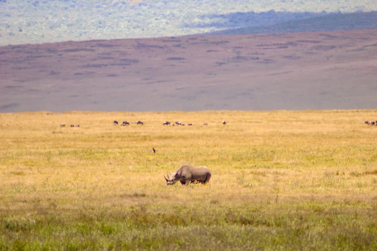 You will probably see her at distance, framed by the crater wall, head down in the long grass like a grey boulder that has decided to walk. The number of black rhinos still alive in Tanzania is small enough to count on your fingers and toes a few times over. Watching one feed in the wild is the closest you will come to standing inside a prehistoric photograph. The black rhino is one of the most heavily protected animals on Earth, and that protection is the only reason any of them are still left. Two centuries ago there were perhaps a million across Africa. By 1995 a sustained poaching slaughter had cut the species to fewer than 2,500. Tanzania alone lost more than 95 percent of its rhinos in two decades. Today the Tanzanian population is one of the most carefully managed wildlife groups on the planet. Despite the name, black rhinos are not black. They are the same dusty grey as white rhinos. The difference is in the mouth. Black rhinos have a hooked prehensile upper lip for stripping leaves and twigs from acacia branches, while white rhinos have a wide square lip built for cropping grass. They live in different habitats and behave very differently, and Tanzania is home only to the black rhino.
