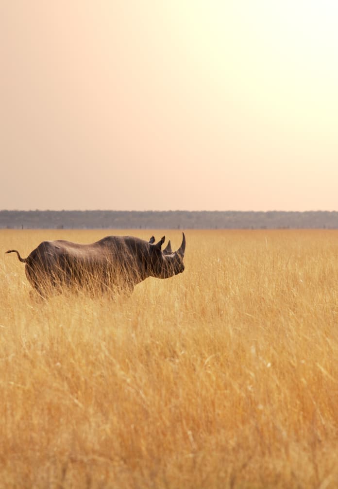 Black rhinos are browsers, not grazers. They use their hooked upper lip to strip leaves, twigs and small branches from acacia, euphorbia and other woody plants. This is the key behavioural and dietary difference from the white rhino, which grazes grass. It also explains why black rhinos prefer scrubby, bushy country.