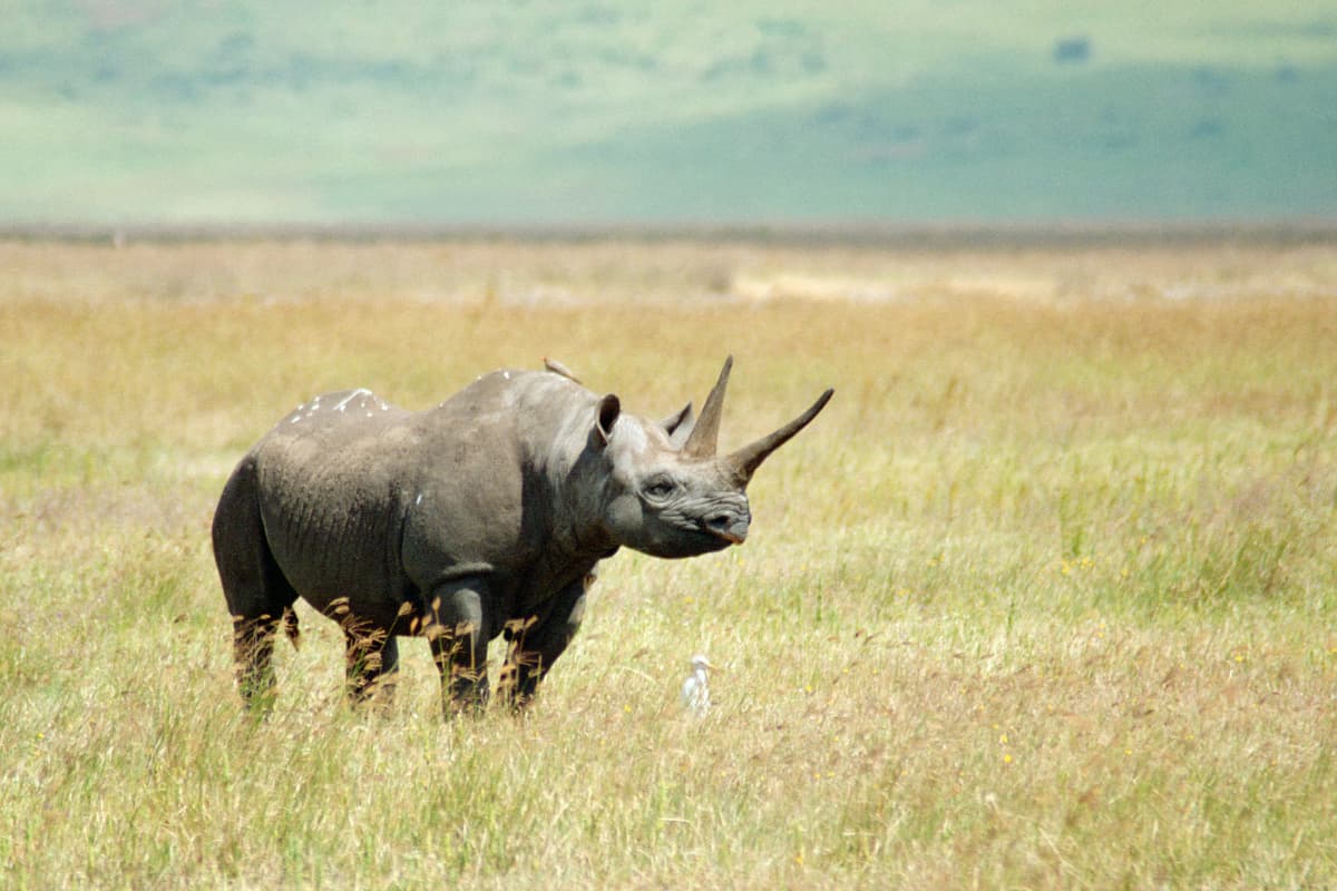 They are largely solitary. A bull will hold a vast territory and tolerate younger males only at the edges. A cow with a calf at heel is the most common pairing you are likely to see, the calf following her closely for up to four years before being driven off as the next pregnancy approaches. Black rhino mothers are famously protective, and they will charge lions, hyenas and even elephants that approach the calf. Their eyesight is genuinely poor, but their hearing and sense of smell are extraordinary. A rhino will pivot its enormous head, ears swivelling like satellite dishes, and lock onto a sound from hundreds of metres away. The defensive charge is mostly a bluff, but the front horn can grow over 60 centimetres long and is made of keratin, the same material as your fingernails. They have a long, almost tender relationship with red billed oxpeckers, who pick parasites from their hides and act as an early warning system. Tanzania's black rhinos tell a story of near loss and slow recovery. The Ngorongoro population was reduced to a handful of survivors in the 1990s and has been rebuilt through round the clock protection by Tanzanian rangers and conservation NGOs. Each individual is named, tracked daily, and known by the rangers who guard them. To see one in the wild today is to witness an active ongoing conservation effort that has refused to fail.