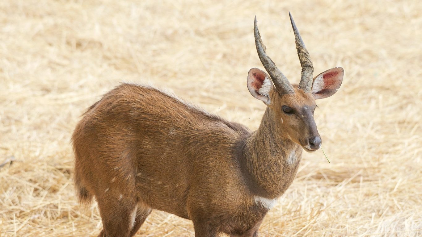 Males are dark chestnut to near black with white spots and stripes on the flanks, a white throat patch, and short twisted horns with a single spiral. Females are lighter reddish brown without horns. Both are compact and solidly built, designed for moving through dense bush at speed.