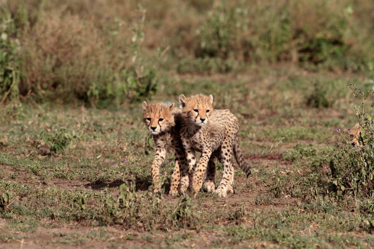 Their social structure is unusual for cats. Females are strictly solitary, raising cubs alone across enormous home ranges that can span hundreds of square kilometres in the Serengeti. Males, however, form coalitions, usually brothers from the same litter, that hold smaller territories within those female ranges. A coalition of three males will outcompete singletons easily and sire most of the cubs in their area. A few facts travellers rarely know. Cheetahs do not roar. They chirp like birds, purr like a domestic cat, and yelp to call cubs across the grass. Genetically they passed through a severe population bottleneck around 10,000 years ago and are so inbred that any two cheetahs alive today can accept skin grafts from each other without rejection. The black tear marks from each inner eye are not decoration, they reduce glare the same way a baseball player smears greasepaint under his eyes. Tanzania's southern Serengeti and the bordering plains hold one of the most studied cheetah populations on Earth. The Serengeti Cheetah Project has tracked individuals continuously since 1974. If you watch a female with cubs on the Naabi Hill plains, your guide can probably tell you her mother's name and where in the Serengeti she was born.