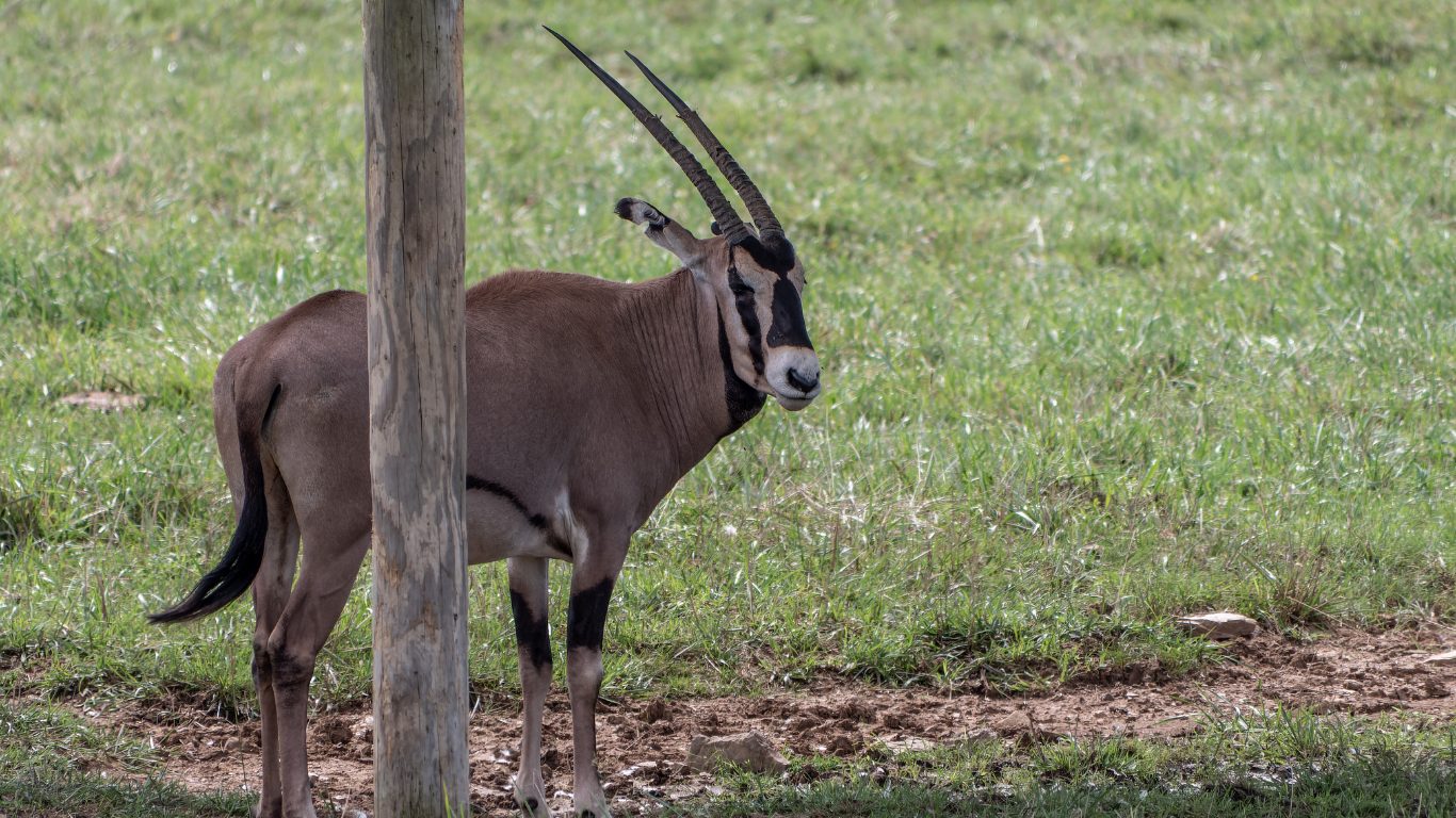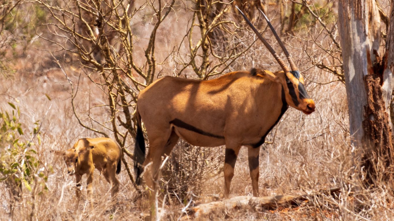 Fringe-eared oryx live in small herds of up to 30 animals, usually mixed groups of females, calves and a few males. Larger aggregations form around seasonal water sources during severe dry spells. Males establish dominance hierarchies through ritualised horn displays and rarely escalate to actual fighting because their long straight horns can inflict serious injury. They graze on coarse dry grasses that other antelopes ignore and supplement their diet with wild melons, tubers and roots that provide moisture. Their ability to use food sources that nothing else can tolerate is the key to their survival in marginal habitat. The fringe-eared oryx population has declined across its range due to habitat loss, competition with livestock and poaching. Inside protected areas they persist but in low numbers. Tarangire and its surrounding wildlife management areas are one of the most important strongholds for this subspecies in Tanzania.