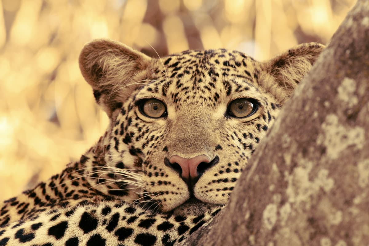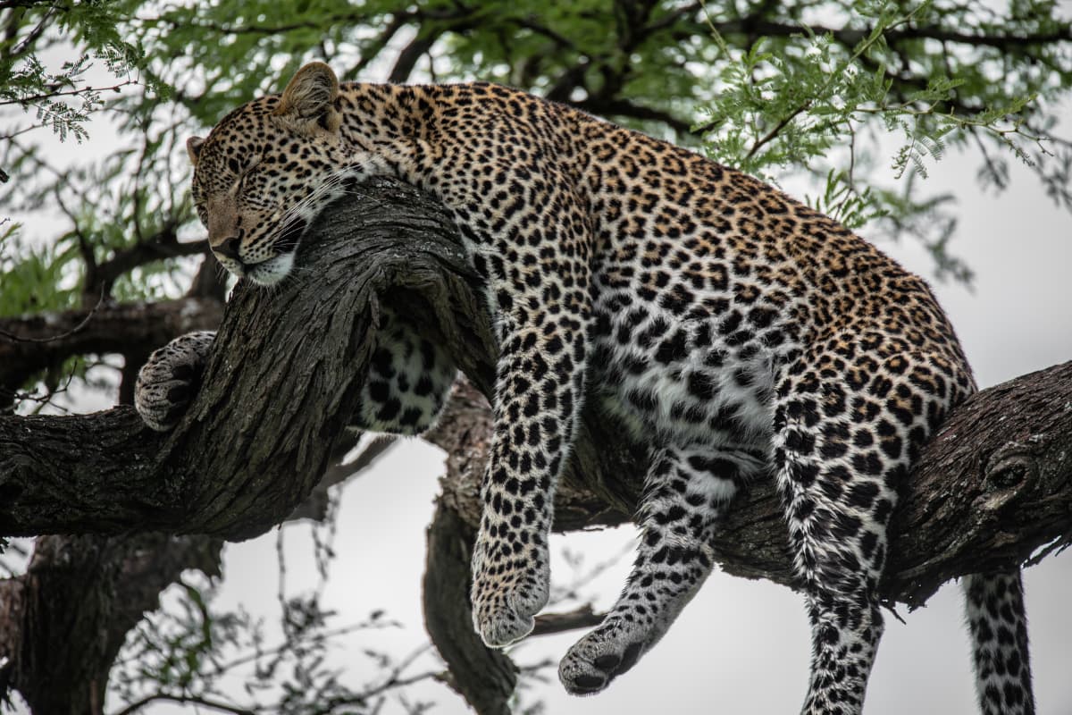 You will not see her unless she lets you. A leopard ten metres from the road, asleep in the fork of an acacia, can vanish into pure pattern the second you look away. The first time your guide picks out a single curl of tail among the leaves, you understand why every other cat in Africa keeps one eye on the trees. Leopards are the most adaptable big cat on Earth. They thrive in deep forest, semi-desert, farmland and the edges of cities. They can take prey from a hare to a young giraffe, hunt by day or night, and survive on water drawn from the moisture in their food. In Tanzania alone they hold territory from the forested flanks of Kilimanjaro down to the floor of the southern reserves. Solitary and territorial, leopards live their entire lives at a careful distance from one another. Males defend ranges of around thirty square kilometres, females hold smaller cores within them, and communication happens almost entirely through scent, claw marks and a low sawing call that sounds like wood being cut. You may hear it on a still night before you ever see the cat.