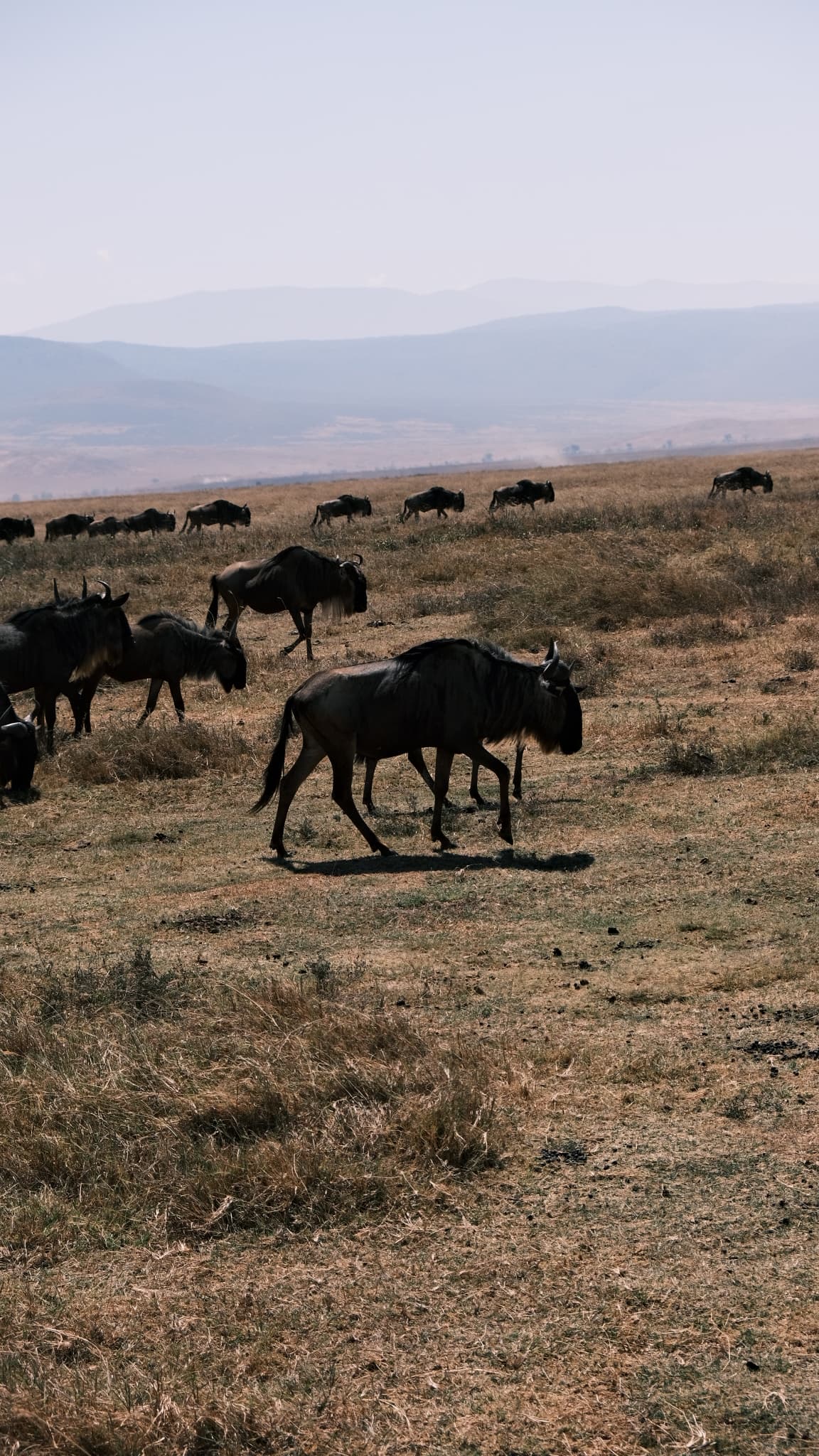 You hear them before you see them, a low continuous grunting that carries half a kilometre across the grass. Then the horizon starts moving. A herd of wildebeest in full migration is not a herd in any normal sense, it is a slow moving river of animals five kilometres wide that takes hours to pass. Standing on a kopje and watching it flow beneath you is the closest thing in modern wildlife travel to seeing the African plains as they have always been. The wildebeest is the engine of the Serengeti ecosystem, and almost everything else in this part of Tanzania depends on its movements. Roughly 1.5 million animals follow an annual circuit of more than a thousand kilometres, chasing the rains and the fresh grass they bring. The whole loop has been running for at least a million years and is the largest land migration on Earth. A wildebeest is built for movement and almost nothing else. Heavy shoulders, sloping back, narrow hindquarters, beard like an old man. It is essentially a grass burning machine, and it converts more biomass into protein, faster, than any other large mammal in Africa. New born calves are on their feet within three minutes of birth and running with the herd within fifteen, the fastest neonatal mobility of any large mammal.